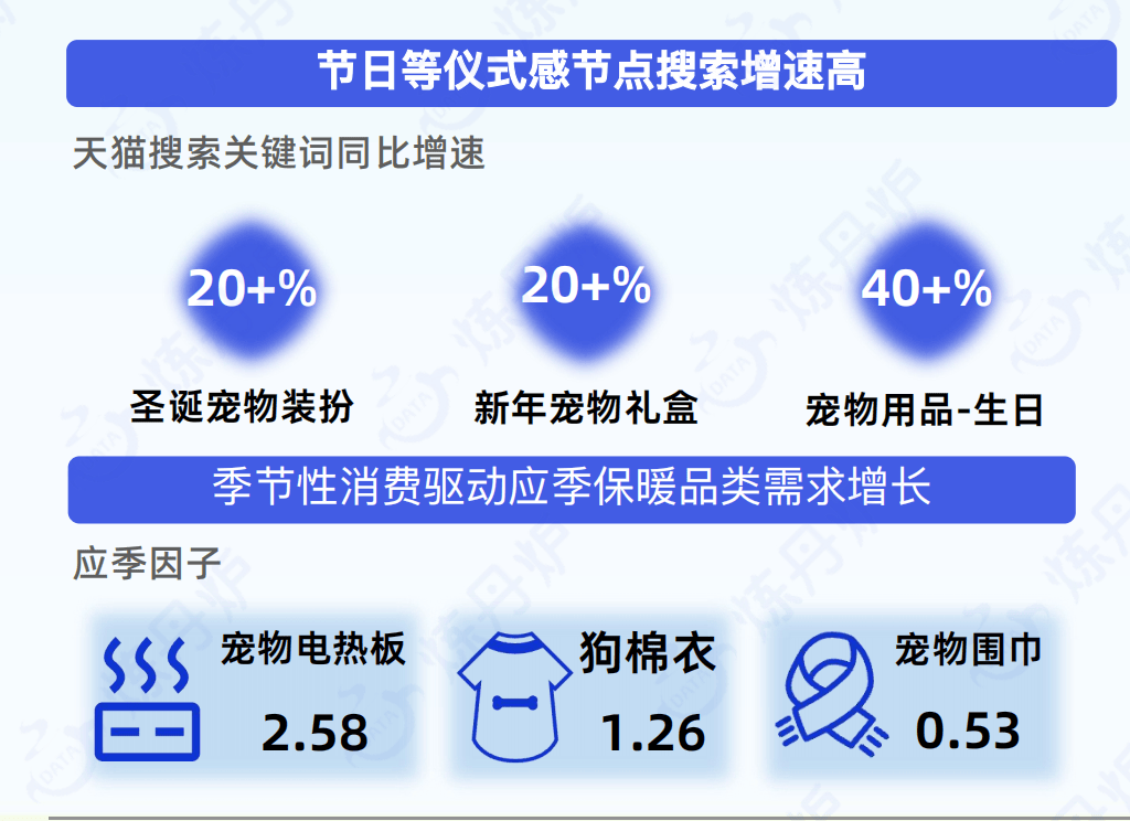 数据显示,节日等仪式感节点期间,天猫宠物相关搜索词增速提高,例如圣诞期间宠物相关装扮搜索增长超20%、过年期间宠物新春礼盒搜索增长超20%、宠物生日礼物搜索增长超40%。