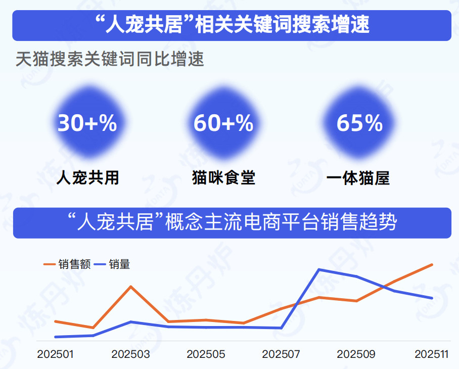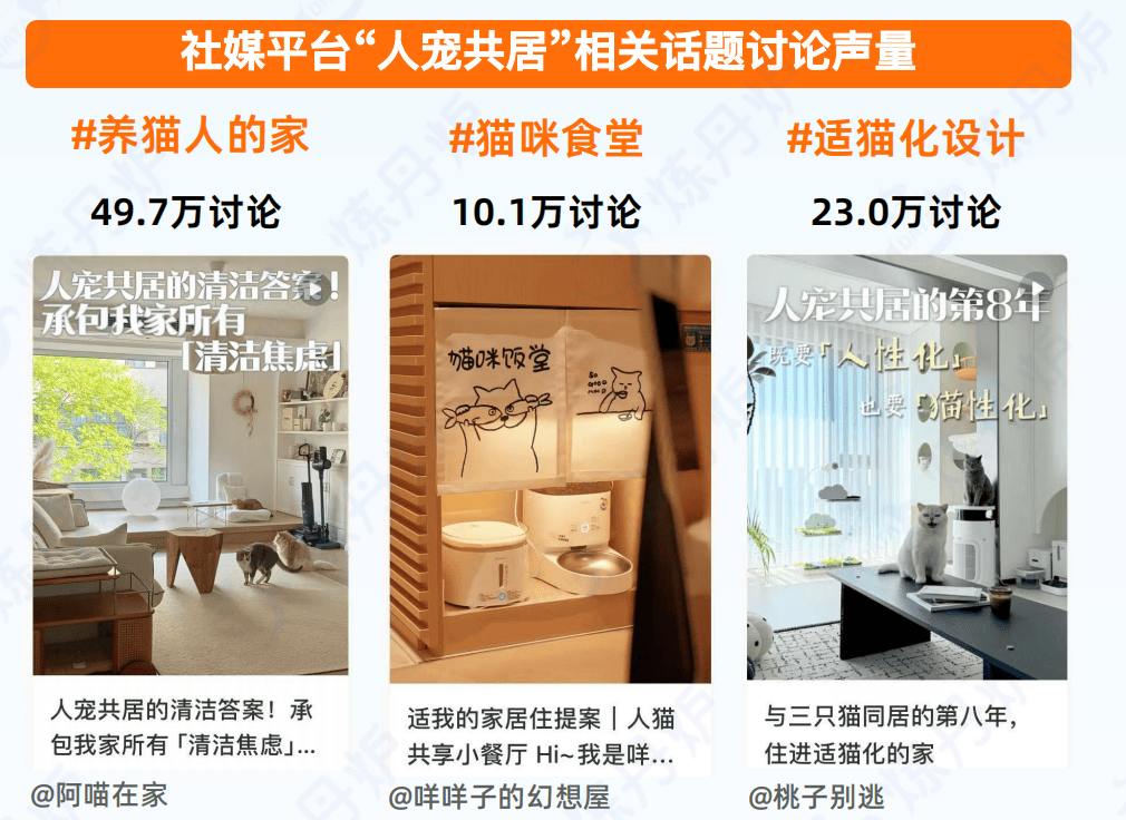 “人宠共居”相关关键词搜索增速迅猛,社媒上“养猫人的家”等话题引发大量关注与分享,催生了融合家具、模块化猫爬架、宠物情绪安抚产品等新品类的兴起。