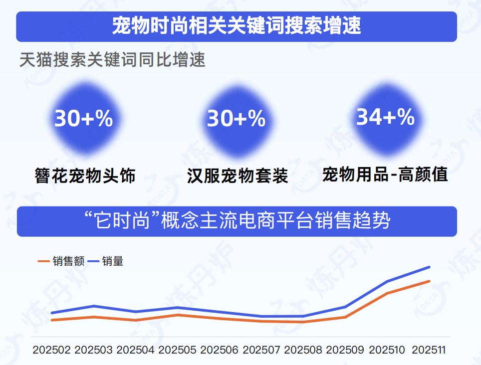 社交平台的快速传播,让宠物穿搭分享成为新型养宠社交场景。相关关键词搜索增速显著,社媒话题讨论声量高涨,显示出强大的市场驱动力。